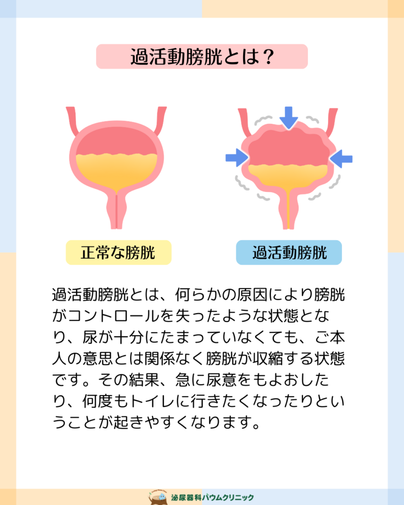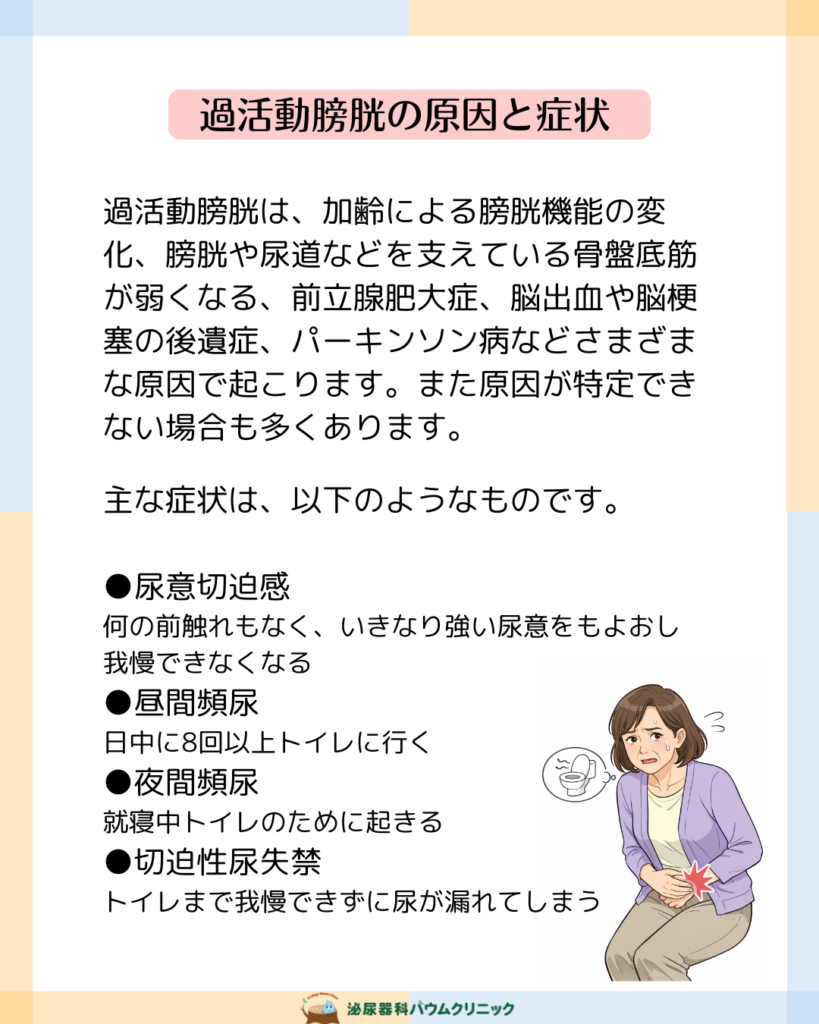 過活動膀胱は、膀胱炎などの炎症や前立腺肥大症、加齢や妊娠・出産に伴う骨盤底筋の筋力低下など様々な原因で発症します。