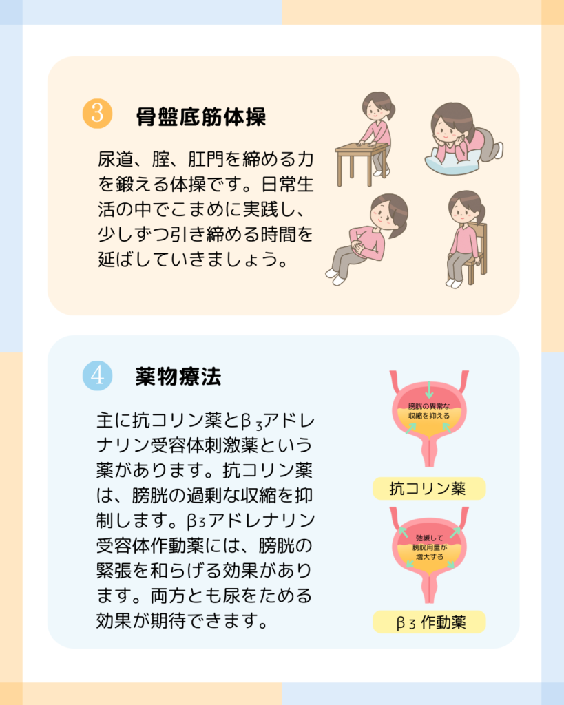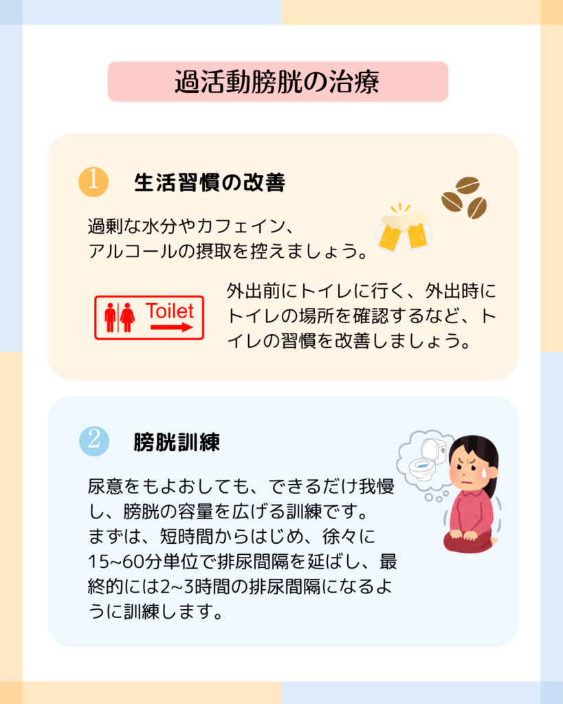 日常生活の中で突然の尿意や尿が漏れるかもといった不安は、行動の制限や生活の質を下げることにつながります。原因が明らかになることで治療や対処法、生活の工夫が分かり、生活の質が改善することが期待できます。「恥ずかしいから」、「年齢のせいだから」とひとりで悩まず、泌尿器科を受診することで日常の不安が減らせるかもしれません。